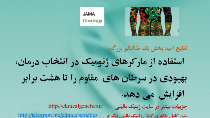 نتایج این مطالعه در مجله جاما اونکولوژی منتشر شده است . این نتایج که بعد از بررسی 346 مطالعه بالینی بر روی 13203 منتشر شده است نشان می دهد که در گروهی از مطالعات که بصورت درمان هدفمند و مبتنی بر بیومارکرها انجام شده است 30% بیماران به درمان پاسخ داده اند حال آن که در گروهی از بیماران که این گونه درمان انجام نگرفته است این میزان نزدیک به پنج درصد بوده است. به علاوه آن دسته از بیماران که درمان مبتنی بر بیومارکر های اختصاصی انجام داده اند دوره طولانی تری از رهایی از بیماری را تجربه کرده اند.